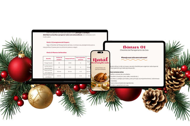 A promessa? Em menos de uma semana, você terá tudo pronto: cardápio escolhido, compras feitas e plano de execução traçado. Um Natal delicioso, leve e sem estresse. Do jeitinho que você merece.